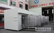 (8)烘干箱內(nèi)可存放1輛推車。推車配置耐高溫角輪(定向輪、萬(wàn)向輪各2個(gè)),推車?yán)锩姘惭b限位柱用于定位里面托盤,兩側(cè)配有L形托架,用于支撐及左右限位托盤。進(jìn)出口裝有手動(dòng)爐門。頂部部置循環(huán)風(fēng)機(jī)、蒸氣換熱器等裝置,排廢風(fēng)機(jī)安裝在爐體頂部。